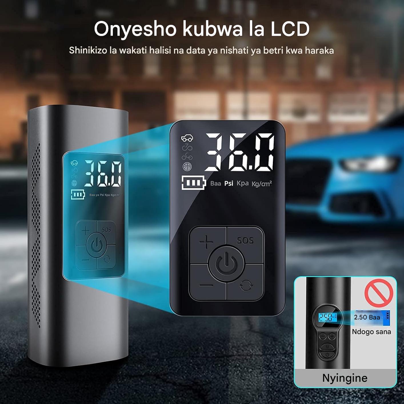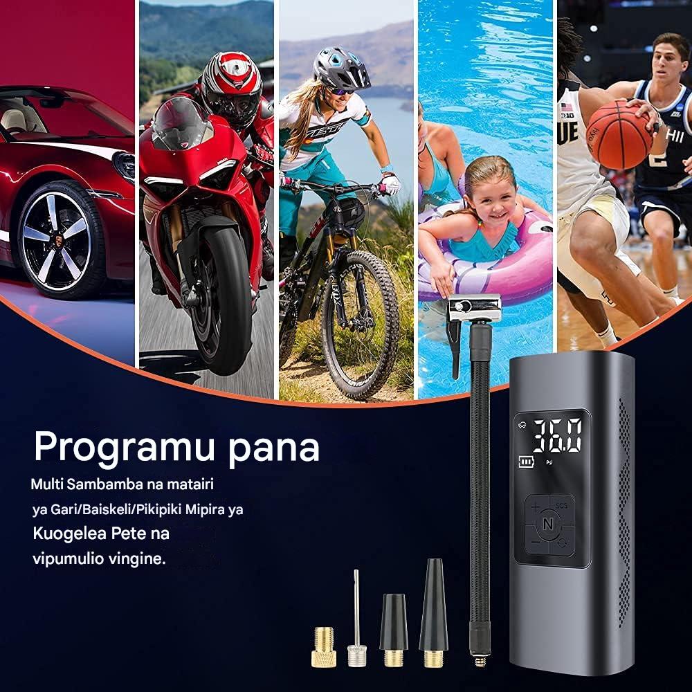 Kompresha hii ndogo yenye betri yenye nguvu ya 6000 mAh hukuruhusu kupulizia tairi za gari, pikipiki, baiskeli hata mipira ya kandanda kwa urahisi na kwa muda mfupi.