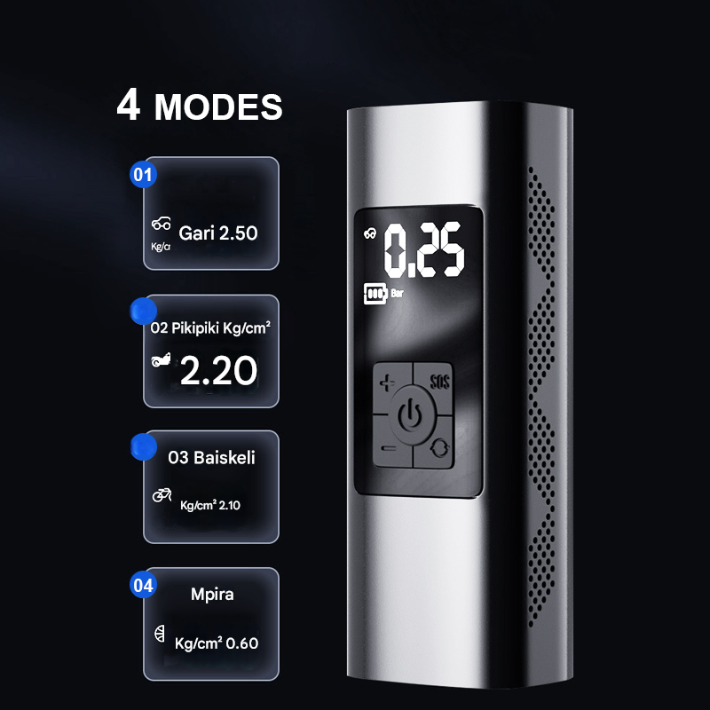 Modi ya Gari: Inafikia hadi 36 PSI, ikihakikisha tairi zako zinajaa kwa usahihi na usalama.